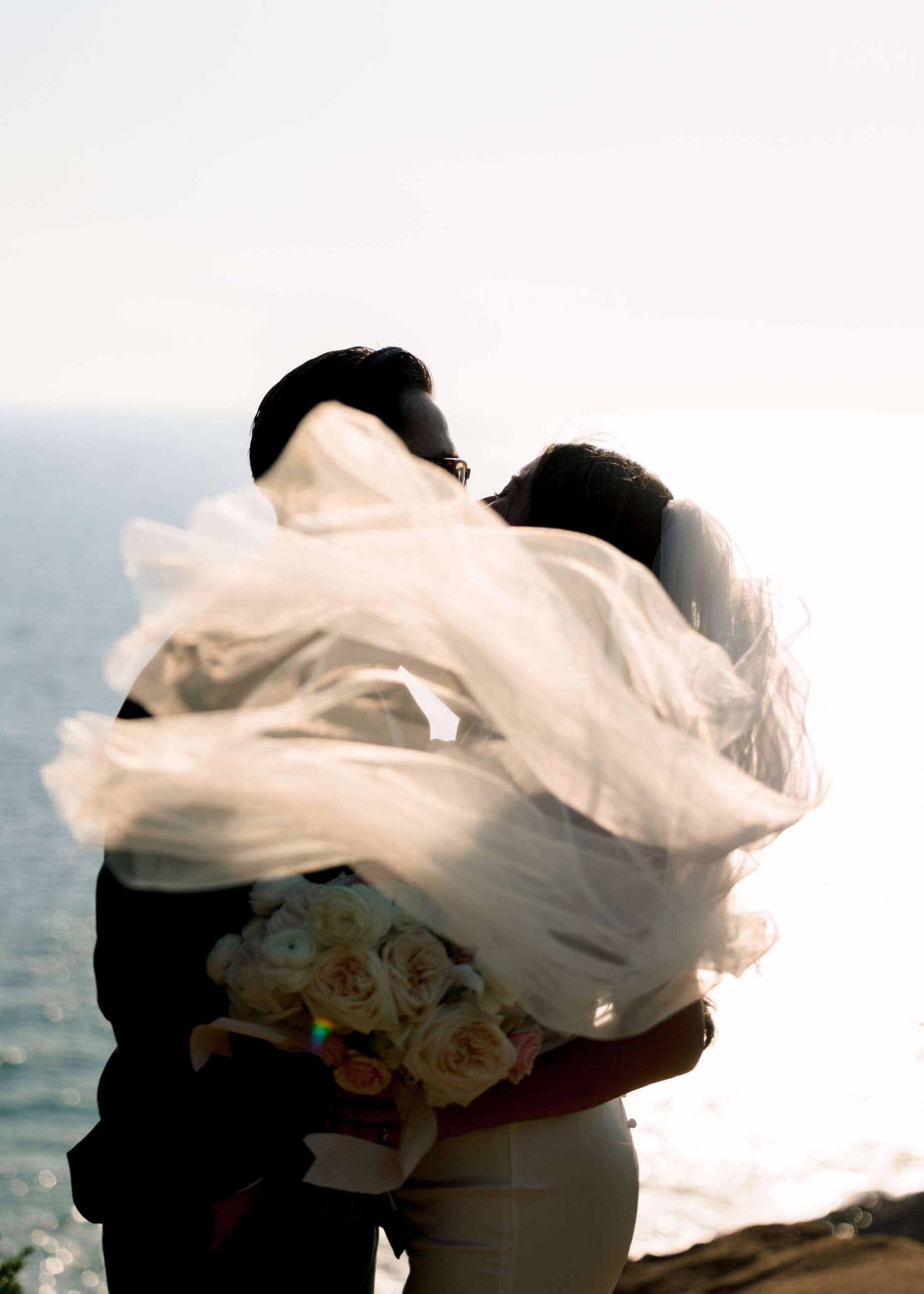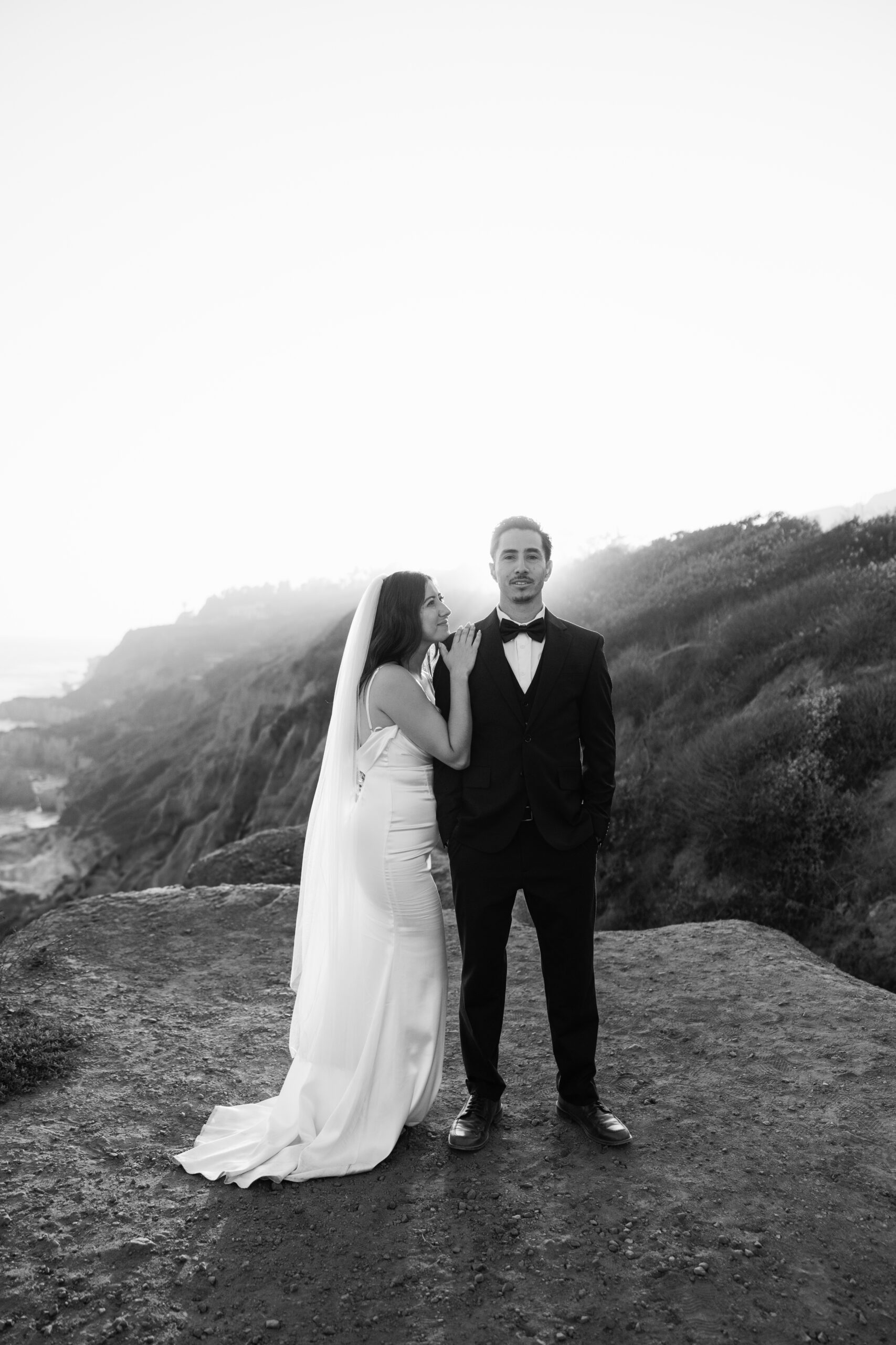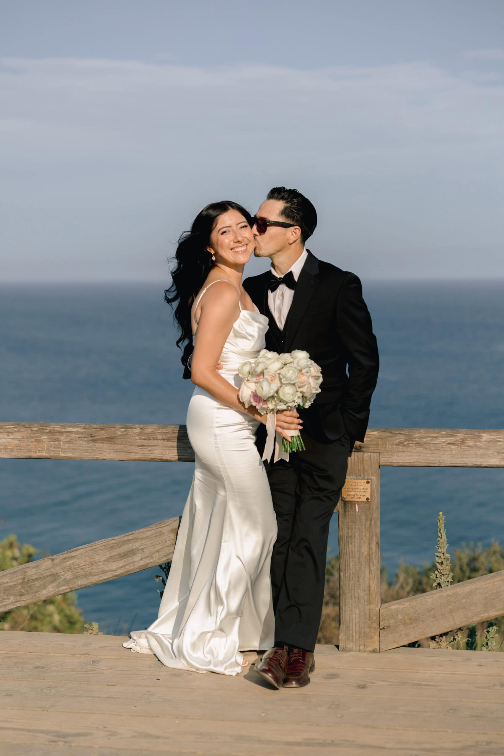 Their ceremony took place at Point Dume, one of Malibu’s most iconic and secluded elopement locations. With panoramic ocean views and total privacy, they exchanged vows on the cliffs overlooking the water.