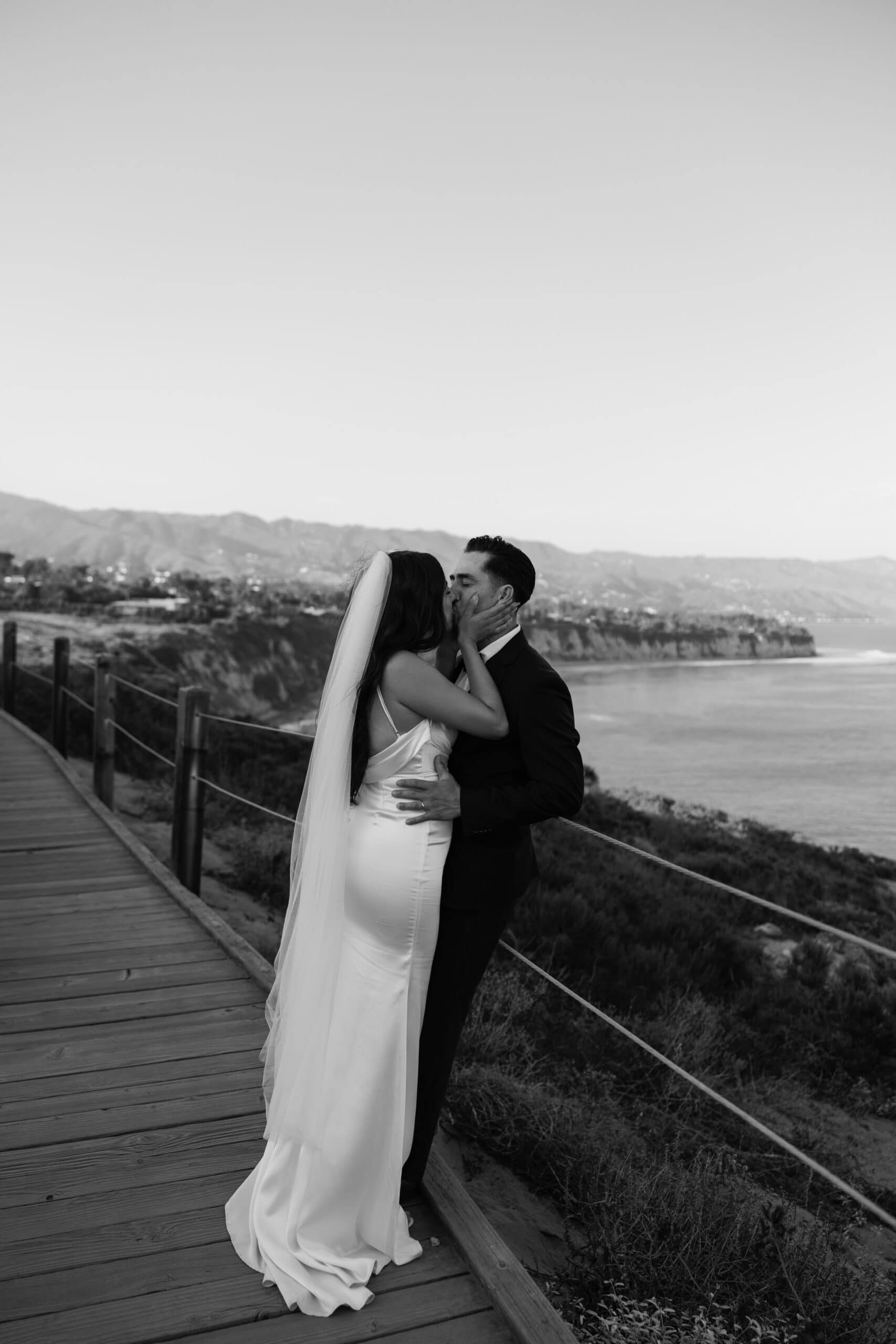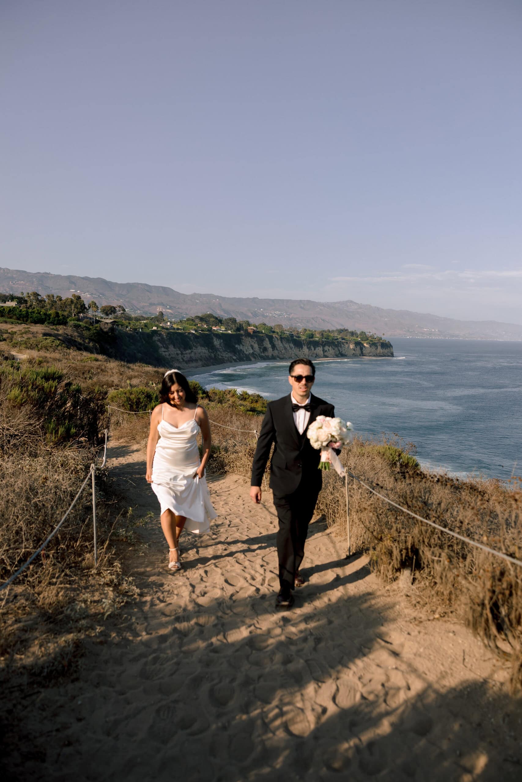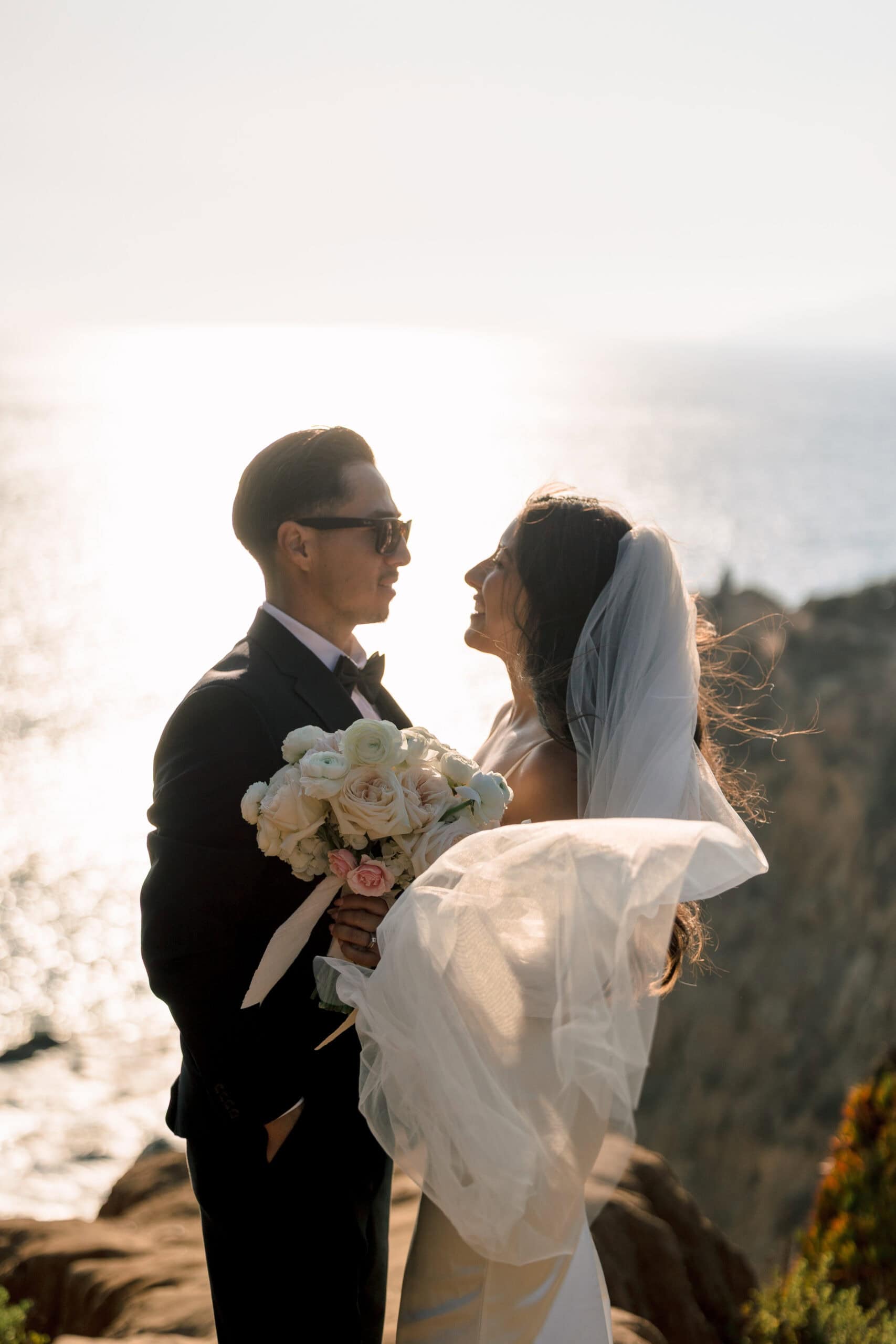 Their ceremony took place at Point Dume, one of Malibu’s most iconic and secluded elopement locations. With panoramic ocean views and total privacy, they exchanged vows on the cliffs overlooking the water.
